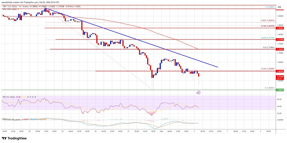 Цена XRP значительно снизилась, опустившись ниже $1.60 и торгуется ниже 100-часовой простой скользящей средней. Валовой слив составил 15%, аналогично Bitcoin и Ethereum. Текущая консолидация указывает на возможное дальнейшее снижение, особенно если цена удержится ниже $1.50. 📊 Ключевые моменты: - Падение цены XRP ниже $1.60, достигая минимума в $1.50. - Ключевая медвежья линия тренда с сопротивлением на уровне $1.650. - MACD для XRP/USD ускоряется в медвежьей зоне, RSI ниже 50. - Уровни поддержки: $1.540, $1.5150, далее $1.4650 и $1.420. - Уровни сопротивления: $1.60, $1.650, $1.720, $1.770, $1.80, $1.8350, $1.90. ⚠️ Риски: Возможное дальнейшее снижение, если XRP не сможет пробить сопротивление на уровне $1.60. Горизонт: краткосрочный