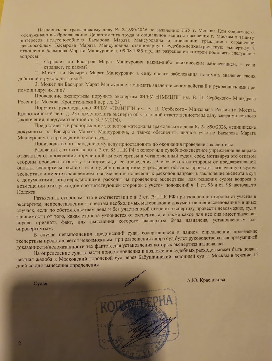 тому, что я сделал. Очень жестокое и необоснованное. Меня интенсивно лечили начмед Мишеева А.А. по письменной просьбе моего отца Басырова М.А. проживающего по адресу г. Москва ул. Мантулинская д. 10 1-ый под. кв. 9. Мишеева А.А. сама сообщила мне о письме от отца, 19.10.2021г., когда она, и психиатр Прусова Т.В., которая на тот момент была моим лечащим врачом, пришли в ПКО (противоковидное отделение), где я находился после приезда из ПКБ №4 Ганнушкина. Через 10 дней, 29.10.2021г., меня госпитализировали повторно, не разъяснив причину и цели, и не предупредив меня об этом. Начальство ПНИ №23, действуют в угоду моим родным. Мне принадлежит 1/4 от общей доли в квартире, но я не могу там проживать, поскольку я недееспособный.