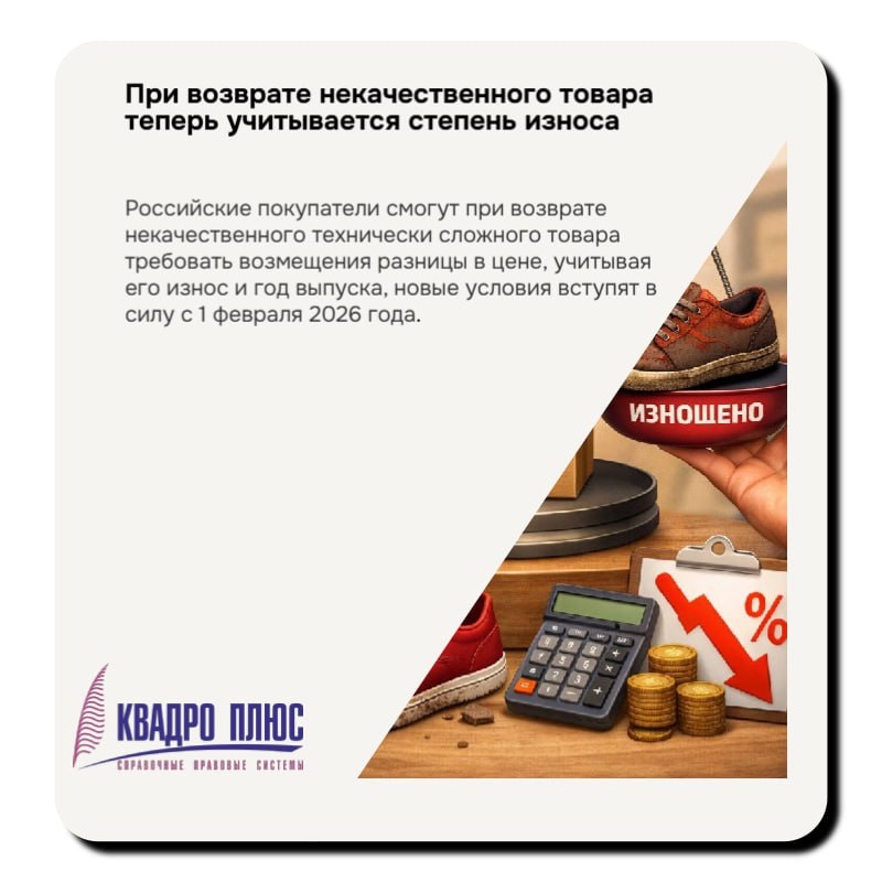 ✔️Для расчета компенсации при возврате некачественного технически сложного товара теперь учитывается степень его износа ✔️Установлены случаи, при которых не взыскиваются штрафы в рамках Закона о защите прав потребителей ✔️Введение новых правил отслеживания перевозок товаров в ЕАЭС с 1 февраля 2026 года ✔️Расширяется функционал реестра обязательных требований ✔️Установлена форма уведомления о выбранном объекте налогообложения, в отношении которого предоставляется налоговая льгота по транспортному налогу ✔️Расширяются возможности для использования "цифрового паспорта" ✔️Истекает срок применения мер поддержки угольной отрасли, введенных Правительством РФ ✔️Меняются условия "Семейной ипотеки" ✔️ФНС утвердила особенности учета крупнейших налогоплательщиков ✔️Пособия, соцвыплаты и компенсации с 1 февраля 2026 года #важныезаконы