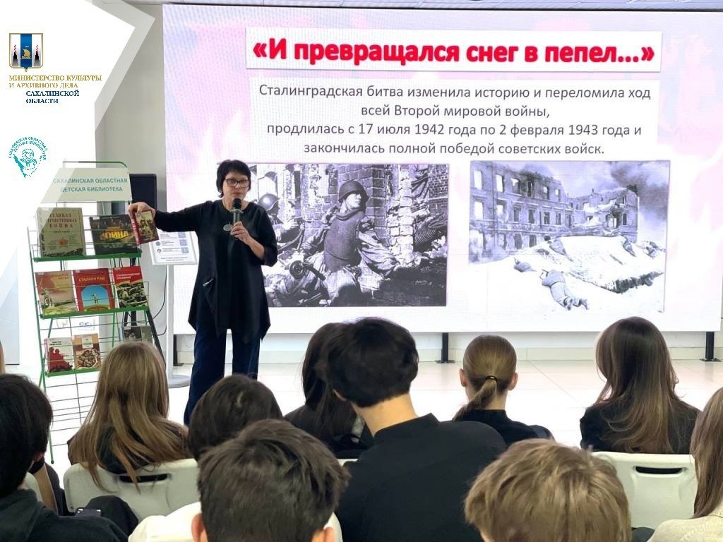 📆 В Сахалинской областной детской библиотеке 2 февраля – в День разгрома советскими войсками немецко-фашистских войск в Сталинградской битве – прошёл тематический час «И превращался снег в пепел» для учащихся средней общеобразовательной школы №22. Это название, словно дыхание тех далёких зимних дней, когда над Сталинградом стоял мороз, смешанный с дымом и огнём. На мероприятии организаторы постарались прикоснуться к истории не только разумом, но и сердцем – чтобы участники почувствовали оттенки мужества, боли и надежды, которыми была наполнена одна из величайших битв Великой Отечественной войны. Подробнее - в нашем канале в MAX: https://clck.ru/3RaMVG
