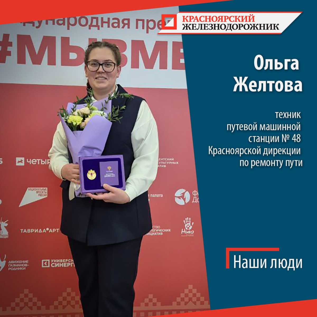 ⚡ Героиней сегодняшнего номера газеты «Гудок» стала техник путевой машинной станции № 48 Ольга Желтова. Она первая девушка – работник ОАО «РЖД», удостоившаяся новой волонтёрской награды правительства России. 🏅 На Международном форуме гражданского участия «Мы вместе» в декабре в Москве красноярской железнодорожнице вручили нагрудный знак «Доброволец России». ❤️ «Для меня волонтёрство – стиль жизни, мне важно быть полезной людям», – говорит наша Ольга Желтова. 🌿 Вернувшись в Красноярск, она продолжила заниматься волонтёрством. В качестве тимлидера помогала в организации баскетбольного матча и ледового шоу Ильи Авербуха. Январь тоже посвятила добрым делам: участвовала в 12 мероприятиях, в том числе в акции «Внуки по переписке». 🚄 А в минувшие выходные Ольга руководила работой волонтёров на XXXVII Международных соревнованиях по вольной борьбе среди мужчин и женщин «Кубок Ивана Ярыгина», которые завершились в Красноярске 1 февраля. Подробнее о волонтёрской активности рассказали зде