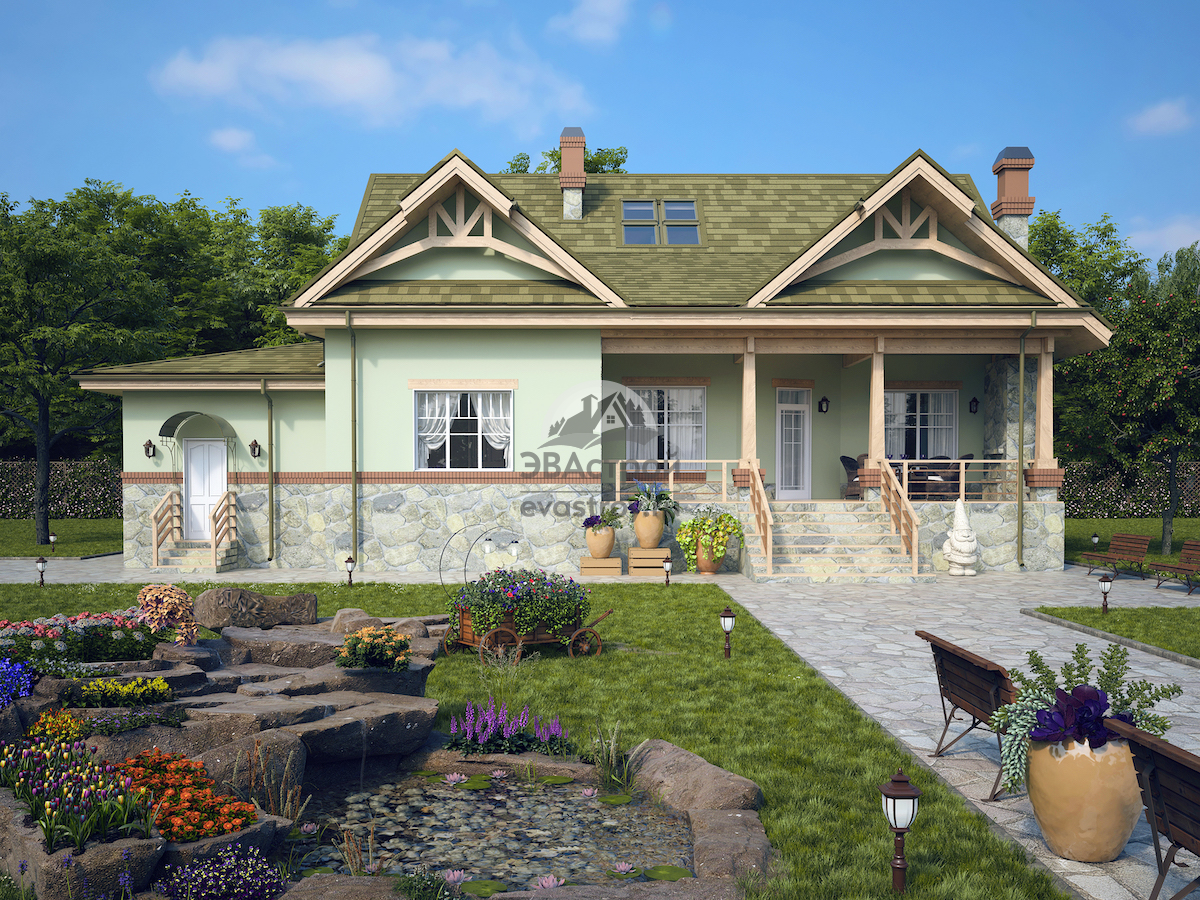 Номер проекта: 106-55 (П27) Разделы проекта: Архитектурный и Конструктивный разделы Узнать о проекте больше можно на сайте evastroy.ru или по телефону +7 (495) 175-30-40 Двухэтажный мансардный дом в стиле «фьюжн» — предложение для большой семьи. Общая площадь здания составляет 280 м2 при габаритах — 15.5 x 19.2 м. Хозяевам доступны: 6 спален, из них три на первом этаже; двусветная гостиная; кухня-столовая; пристроенный одноместный гараж; крытая терраса. Технические решения, дизайн Для данного дома предусмотрена газобетонная технология — строительство ведется из 400-мм блоков. Тип фундамента — сборно-монолитная ж/б лента из блоков ФРС. Межэтажное перекрытие сборно-железобетонное, мансардное — по деревянным балкам. Фасады в нижней части покрыты декоративным камнем, в верхней — штукатуркой. По границе материалов проходит вставка из клинкерного кирпича, который используется также и в обрамлении окон. Кровля выполнена из мягкой черепицы. На первый этаж ведет высокое крытое крыльцо. В тамбур