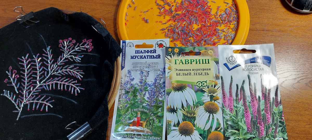 Ну, во-первых, сумочку театральную я продолжаю вышивать. Считаю, что вовсе даже и не плохо получается её основа. Мне нужно не перегрузить эту сумочку разными цветами бисера и не нужно заполнять много пространства в рисунке разным бисером на черном фоне, потому что рисунок у меня там все-таки воздушный такой.