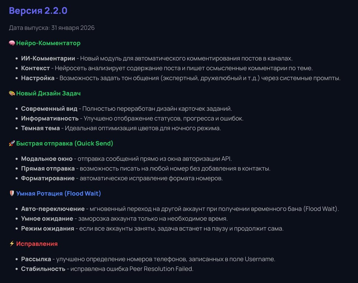 Добавил новую функцию - Нейро Комментатор. Эта функция позволяет настроить осмысленные автокомментарии к постам на каналах с Анализом текста поста. А так же оставлять реакции к посту с заданым тоном (негатив-позитив) и вероятностью. Обновленный дизайн страницы Задания. Кнопки управления стали более удобными, а карточки информативными. Добавлена новая функция быстой отправки сообщения по номеру телефона. Если у вас аккаунт авторизован в API то просто нажимте на кнопку API справа вверху и появится форма быстрой откравки по номеру телефона. Ранее описывал уже эту функцию на Канале. Реализована умная ротация в рассылке при получении ошибки Flood Wait (при превышении лимита в ТГ) Сейчас система будет пытаться повторно отправить сообщение этому контакту но с другого ТГ аккаунта. А предыдущий будет времено заморожен пока у него не закончится временная блокировка со стороны ТГ. Скачать обновление для Windows \ Mac OS \ Linux можно через этого ТГ бота @tgmaster_ru_bot . Просто запустите ком