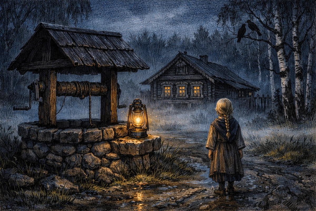 Колодец. Тёмная вода внизу. И в воде — маленькая фигурка. Светлые волосы плывут вокруг головы, как водоросли. Глаза открыты, смотрят в пустоту. Лицо синеватое, неподвижное.