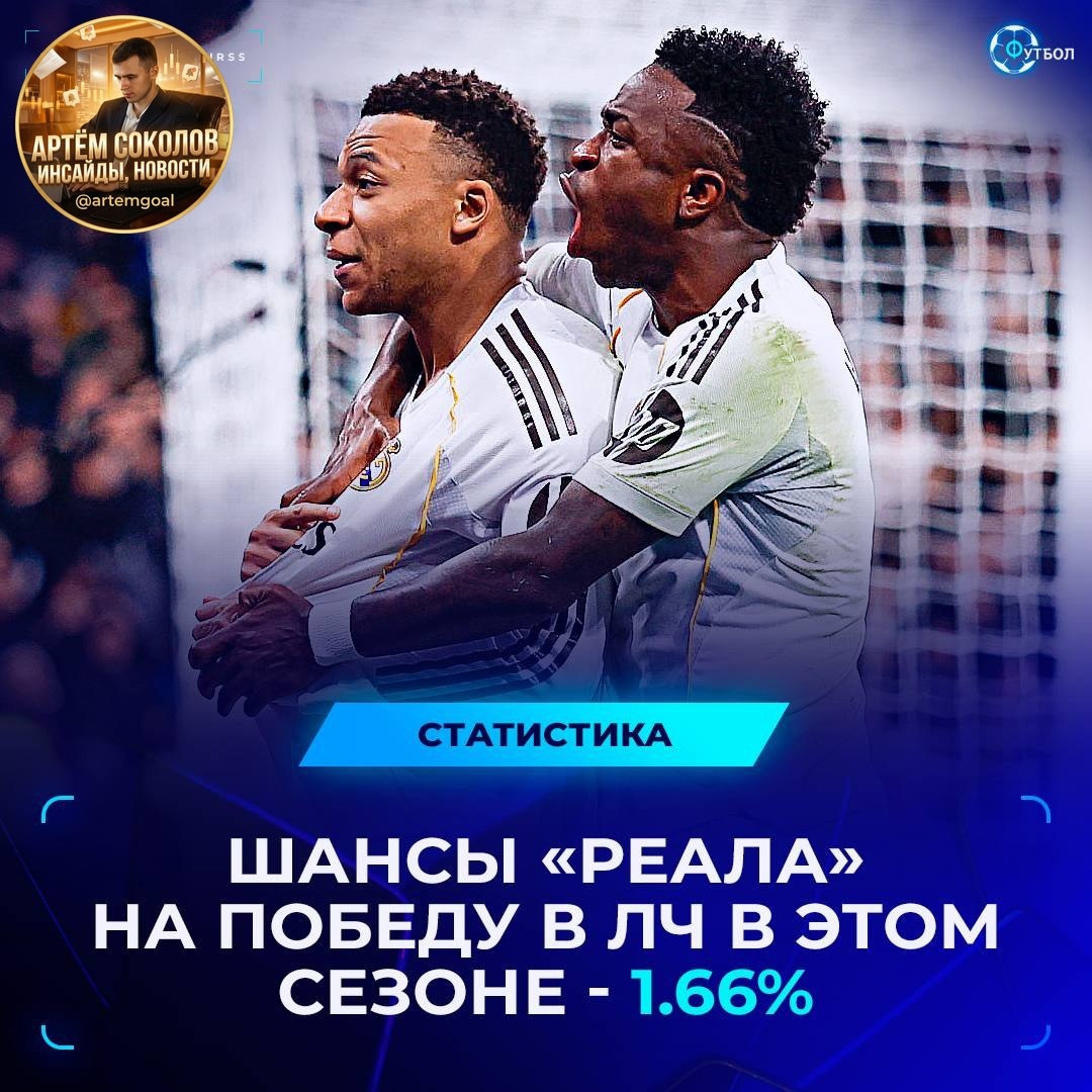 🙁 У «Реала» меньше шансов на победу в ЛЧ, чем у «Спортинга» и «Тоттенхэма» 🏴 1. «Арсенал» - 30.64% 🇩🇪 2. «Бавария» - 15% 🏴 3. «Ман Сити» - 10.99% 🏴 4. «Ливерпуль» - 8.77% 🏴 5. «Челси» - 7.25% 🇪🇸 6. «Барселона» - 7.24% 🇫🇷 7. «ПСЖ» - 4.94% ⚽️ 8. «Ньюкасл» - 3.16% 🇮🇹 9. «Интер» - 2.63% 🏴 10. «Тоттенхэм» - 2.32% 🇵🇹 11. «Спортинг» - 1.79% 🇪🇸 **12. «Реал» - 1.66%** 🇪🇸 13. «Атлетико» - 0.86% 🇮🇹 14. «Ювентус» - 0.63% 🇩🇪 15. «Боруссия» - 0.62% 🇵🇹 16. «Бенфика» - 0.47% 🇮🇹 17. «Аталанта» - 0.33% 🇩🇪 18. «Байер» - 0.31% 🇧🇪 19. «Брюгге» - 0.18% 🇬🇷 20. «Олимпиакос» - 0.1% ⚽️ 21. «Галатасарай» - 0.05% 🇳🇴 22. «Буде Глимт» - 0.04% 🇫🇷 23. «Монако» - 0.02% 🇦🇿 24. «Карабах» - 0.00% Артём Соколов | Инсайды, Новости