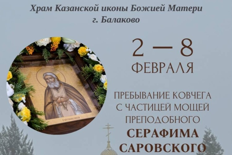 Уважаемые православные жители Балаковского района! Со 2 по 8 февраля в храме Казанской иконы Божией Матери г. Балаково будет пребывать ковчег с частицей мощей преподобного Серафима Саровского. Встреча ковчега состоится 2 февраля за Всенощным бдением в 17:00. Ежедневно в храме будет совершаться молебен с акафистом преподобному Серафиму Саровскому в 16:00. Поклониться мощам можно в часы работы храма с 8:00 до 19:00 по адресу: г. Балаково, ул. Бр. Захаровых, 119. Преподобный Серафим Саровский — один из самых почитаемых святых Русской Православной Церкви. Верующие, которые едут к нему в Дивеево со всей страны веками, обращаются к нему с просьбами о помощи, наставлении или исцелении.