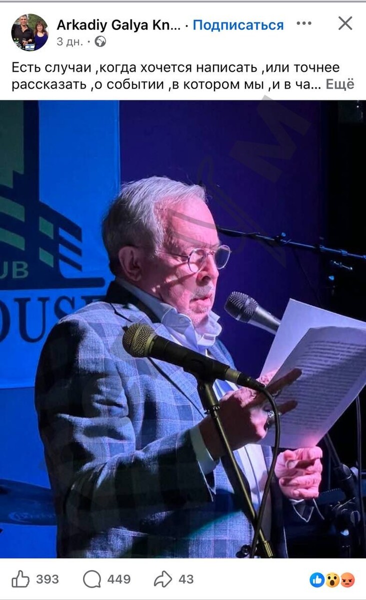 Да, не везет иноагенту Андрею Макаревичу с народом. Сначала не везло с россиянами, а теперь и израильтяне перестали радовать. На днях на "земле обетованной" состоялось очередное алко-выступление иноагента Макаревича - винодела и музыканта. Выступление-то состоялось, но как оказалось, зрители были не в восторге. Один из негодующих поклонников творчества экс-машиниста даже написал пространный пост в соцсетях, собравший почти полтысячи согласных комментариев. "Есть случаи, когда хочется написать, или, точнее, рассказать, о событии, в котором мы, и, в частности, я принимали участие. Таким событием для меня стало вчерашнее посещение Джаз клуба Gig в Хайфе. Там должна была пройти встреча с “друзьями“ Андрея Макаревича и презентация его вина… Друзья «Андрея, должны были сидеть за столиками, и в приятной обстановке слушать несколько рассказов автора и дегустировать вино», говорилось в анонсе... Я скажу так, что если это была встреча с друзьями и знакомыми, то мы с ним больше не друзья и не з