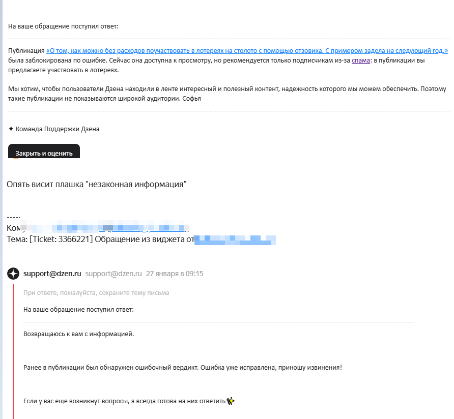 Вообще впору задуматься что машины таки победили. И модель "машина обучается на примерах" уже немного в прошлом. Теперь машина уже отвергает человека, который пишет о неверности решения машины и все-равно решает по-своему. На примере Дзена. В общем написал я статью. Ну такую, я даже не буду спорить что сомнительную, но совершенно точно - законную. Ссылаться я на неё, разумеется, не буду, и даже никаких слов из неё не буду упоминать, ну вы понимаете, чревато. Вот. И сомнительность то такая, условная. Но есть, пляски на лезвии, то есть я не советую, но рассказываю как можно. В общем не суть. А суть в том, что статья банится с плашкой "незаконная информация". Я, конечно, пишу в саппорт, саппорт, разумеется, плашку снимает. И угадайте что я вижу на следующий день? Правильно, плашку "незаконная информация" После чего эту плашку снимают, зато вешают условно-заслуженную и на этом почти всё. Знаете почему почти? Потому что я эту статью даже не удаляю, почти уверен что на неё опять повесят "н