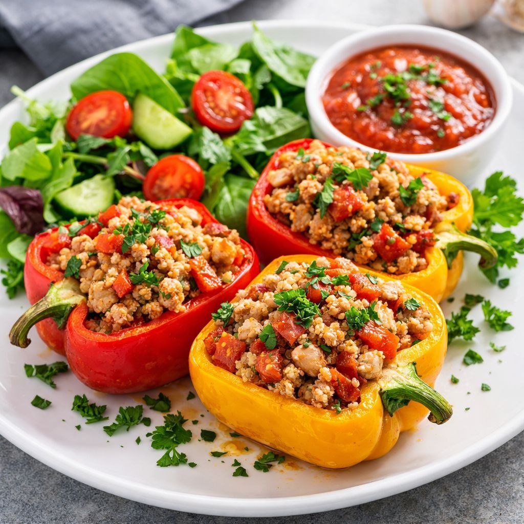 🌶️🦃🍚 Ингредиенты: Болгарские перцы - 2 шт Филе индейки - 150 г Киноа (сырая) - 50 г Лук - 1 шт Чеснок - 1 зубчик Оливковое масло - 1 ч.л. Томатная паста - 1 ст.л. Соль, перец, зелень - по вкусу 👩🍳 Приготовление: 1️⃣ Промойте киноа и сварите в 100 мл воды, доведя до кипения и варите 12-15 минут до готовности. 2️⃣ Нарежьте филе индейки мелкими кубиками. Обжарьте на сковороде с 1 ч.л. оливкового масла до золотистой корочки (около 5-7 минут). 3️⃣ Лук нарежьте мелко, чеснок - мелко порубите. Обжарьте на сковороде с индейкой до мягкости, добавьте томатную пасту, посолите, поперчите и тушите 5 минут. 4️⃣ Смешайте готовую киноа с тушеной индейкой и овощами. Полученную массу уложите в перцы. 5⃣ Перцы с начинкой поставьте в кастрюлю, добавьте немного воды (чтобы покрыть дно) и тушите под крышкой 15-20 минут до полной готовности перцев. 6️⃣ Подавайте, посыпав свежей зеленью.🥄 ⏱️ 40 минут 📊 КБЖУ: ≈ 380 ккал Белки: 35 г Жиры: 8 г Углеводы: 35 г #обед #пп