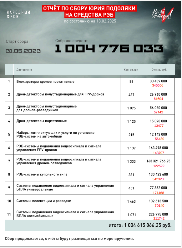 Я тут как то упустил сборы. Подоляка начал публиковать что то. Забавный отчет. Во первых Подоляка верен себе ни копейки в свой карман все на фронт. Что такое 150 тысяч рублей по сравнению с миллиардом. Копейки какие то. Для начала я посчитал каждую позицию в цене за 1 штуку. Забавная картина получилась. Например дрон-детектор по цене игрушечной рации. Да и по остальным цены прям подвальные. И это я только поиском в интернете воспользовался. Но в процессе поиска я столкнулся с одно забавной штукой. Например позиция 2 и 3 это один и тот же прибор. Можно сделать вывод что купили 1500 дронов по цене 52 тысячи рублей. И когда я дальше стал сравнивать то пришел к выводу что все изделия из п.п. 6-11 это одни те же комплексы под разными названиями. При чем пункт 1 это тоже скорее всего РЭБ подавления сигналов. Причем я не смог найти в свободной продаже системы пеленгации и разведки. Оно и не мудрено, это в большинстве своем продукция закрытых предприятий. Вообщем и целом продолжается вешание