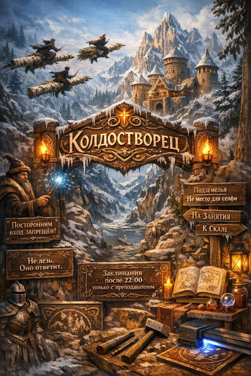 Колдостворец существует. И да — мы бы делали ему рекламу 🧙♂️🔥 Если Хогвартс — это свечи, мантии и поезд, то Колдостворец — это мороз, скалы, берёзы и “держись, сейчас будет магия”. Древняя русская школа волшебства, спрятанная так хорошо, что: Навигатор теряет веру в себя, Google Maps шепчет «ну его», а ученики прилетают туда не на поезде, а на зачарованных деревьях. И вот честно — если бы Колдостворец открывался сегодня, без Ва Групп он бы выглядел как просто подозрительный лес 🌲 🪄 Немного лора (чтобы вы тоже почувствовали магию) Колдостворец — одна из старейших школ магии в мире. Расположен в горах, скрыт чарами, суровый, как русская зима, и атмосферный, как фраза: «Не трогай. Оно древнее.» Традиции, история, характер — идеальный пример бренда с сильным ДНК. 🧹 Если бы Ва Групп оформляла Колдостворец ✨ Вывеска Не просто «Колдостворец», а: резная, массивная, с мягкой подсветкой, и эффектом «она как будто живая». Потому что школа магии без эффектной вывески — это либо тайное общест