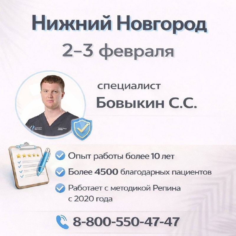 ✈️НИЖНИЙ НОВГОРОД УЖЕ 2-3 ФЕВРАЛЯ 👨⚕ Специалист: Бовыкин С. С. Адрес приёма: Площадь Горького, ул. Новая, д. 28 1 подъезд, 2 этаж Ориентир — вывеска Wildberries 5 минут от метро Горьковская или 5 минут от остановки Студёная КАК ЗАПИСАТЬСЯ: 📲 Онлайн-запись: http://n458139.yclients.com/ ☎ РФ: +7 (800) 550-47-47 🌍 СНГ: +7 (499) 390-17-90 ✉️ Или напишите нам в любое сообщество. 🚑 С какими жалобами обращаются: ✅ Хронические и острые боли в спине, шее, пояснице ✅ Онемение, покалывание, «ток» в конечностях ✅ Перекосы таза, нарушения осанки, скованность ✅ Нарушения подвижности суставов ✅ Убирает боль в суставах ✅ Последствия грыж, протрузий, сидячего образа жизни ✅ Восстановление после травм, спортивных травм Мы уже ведем прием, осталось несколько свободных мест! До встречи в вашем городе 🤝