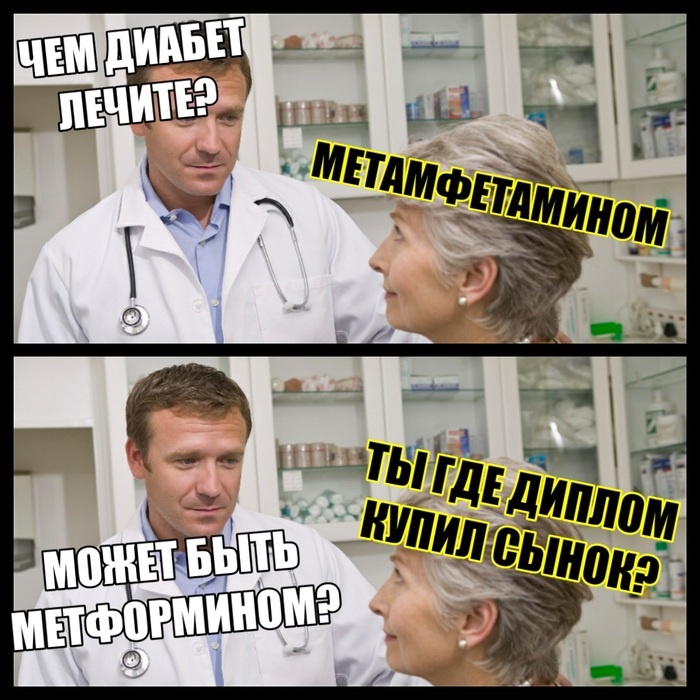 Вчера консультировал очень пожилую женщину с таким же пожилым диабетом и повторил ситуацию из мема. Спрашиваю, что принимаете, что принимали: