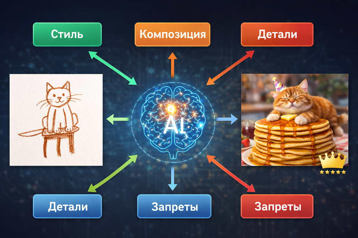 Перестаньте гадать. Используйте эти 4 продвинутых приёма, чтобы нейросеть слушалась с первого раза. Вы уже знаете базовую структуру промпта. Но что делать, когда нужен не просто «кот в шляпе», а «кот в шляпе стиля ар-деко, сидящий в позе мыслителя на геометрическом постаменте, вид сбоку, монохромное золото на чёрном фоне»? Добро пожаловать на уровень PRO. Сегодня разбираем приёмы, которые используют профессионалы. 1. Весовые коэффициенты: Ранжируем важность.