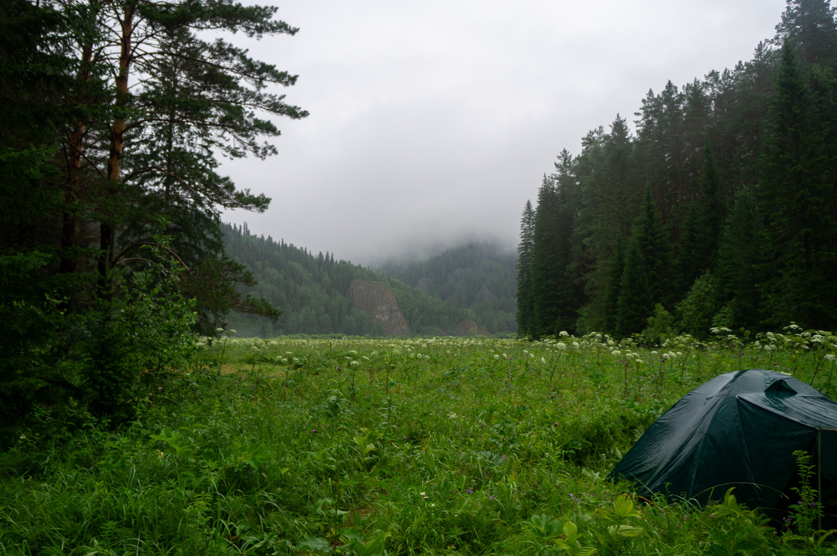 Просыпаться в палатке под шум дождя — удовольствие небольшое. Хочется еще полежать, переждать, может, как-нибудь перестанет. Но сегодня, выглянув на улицу, сразу понимаешь, это надолго. Значит, придется отплывать под дождем, собирать мокрые палатки. Ну ничего, вечером их уже не ставить, дома просохнут. Одноразовый плащ-дождевик — баловство, для города. Плащи из ткани, как показала практика, протекают по швам. Вот плащ из толстой пленки, с застежкой — это вещь! В нем дождь вообще не страшен. Мне ведь не надо заботиться о том, чтобы ноги не промочить. А так хорошо чувствовать под ногами прохладную мокрую траву и пружинящую, пропитанную влагой землю. За пеленой тумана не видно, что происходит в небе. А там явно что-то творится. Иногда пробиваются отсветы молний, раскаты грома доносятся то с одной стороны, то с другой. Акустика на Мане потрясающая. От одного удара грома эхо носит по ущельям иногда по полминуты. Ради такого, пожалуй, стоило мокнуть. Андрею все нипочем. Для рыбалки и такая п