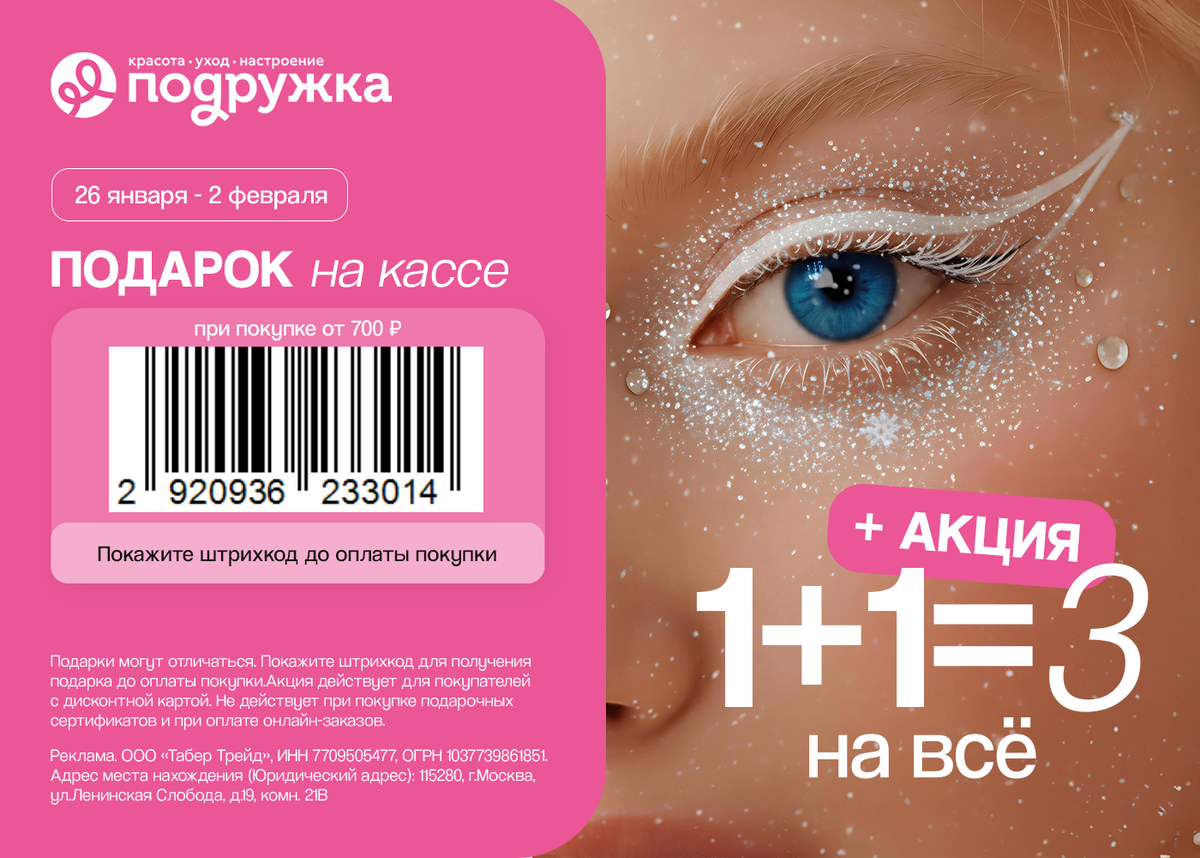 Что общего у уборки и спорта? И то и другое снижает стресс! Активные движения во время уборки – это тоже тренировка, а вид чистого пространства дает мозгу сигнал о завершенности задачи, снижая тревожность. Сделайте процесс еще эффективнее и приятнее с: – Экосредствами без резкого запаха. – Роботами-помощниками для ежедневной поддержки чистоты. – Удобными ершиками, салфетками и губками. Действующие скидки: Оформить заказ на сайте или в приложении https://auchan.prfl.me/profitable_promo_codes/hqgt2t?erid=2Ranykc4HfY PRFWNCWR3 на 25% до 28.02.2026 23:59 - Скидка 25% на первый заказ от 3000 ₽ на сайте или в приложении, но не более 1000 ₽ Реклама. ООО "Ашан", ИНН 7703270067. erid: 2Ranykc4HfY Подарок при покупке от 700 ₽ https://podrygka.prfl.me/profitable_promo_codes/lmwink?erid=2VtzqvTz5Cf 2920936233014 до 02.02.2026 23:59 - Акция 1+1=3, а также подарок при первой и повторных покупках от 700 ₽ Реклама. ООО «Табер Трейд», ИНН 7709505477, ОГРН 1037739861851. Адрес места нахождения (Юр