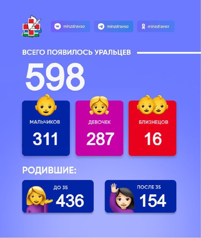 : 311 мальчиков и 287 девочек, из них 8 пар близнецов! 436 мам родили до 35 лет. 154 мамочки родили после 35 лет. Для одной из мамочек это стали девятые по счету роды. 106 малышей стали третьими детьми у своих мам. Мы в МАХ