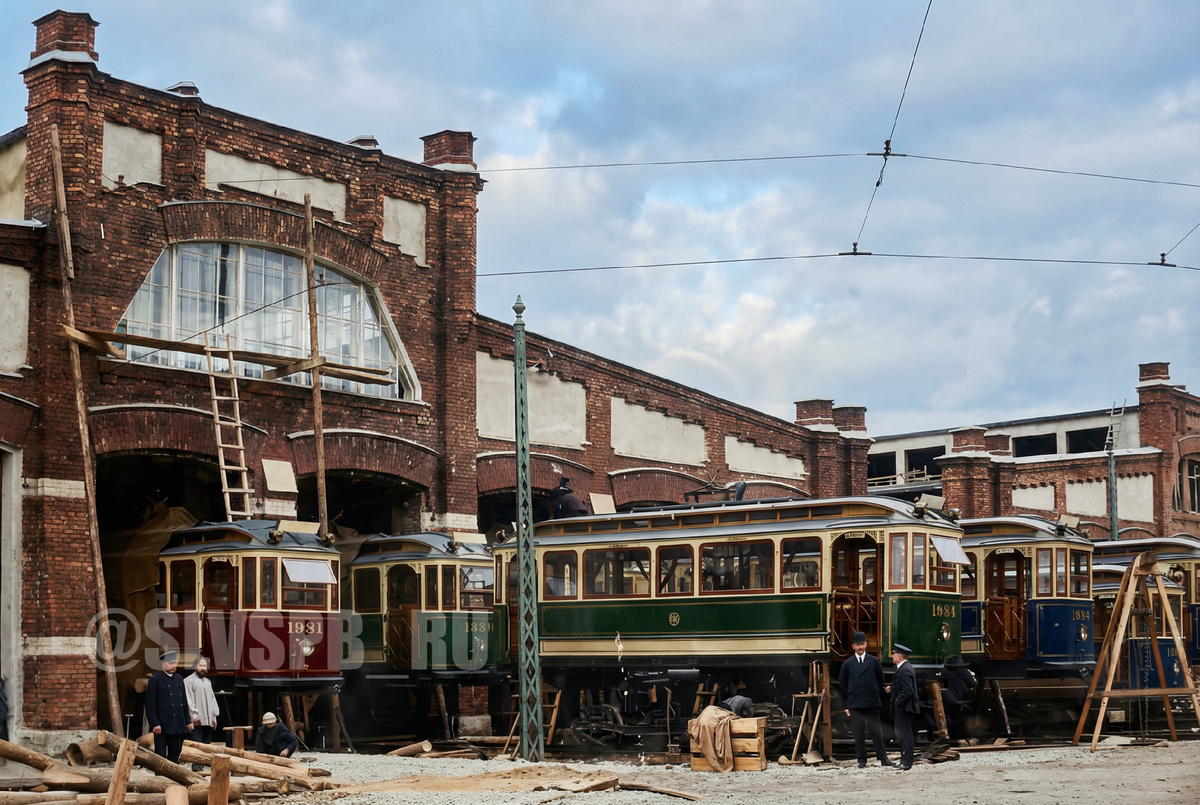 Перед вами практически первое трамвайное депо Санкт-Петербурга. Именно отсюда в 1907 году в конце сентября на городские улицы вышли первые электрические наземные трамваи. Конкурс на строительство трамвайного парка был объявлен еще в 1904 году, конкурировали три известные тогда фирмы. «Сименс и Гальске», «Всеобщая компания электричества» и «Вестингауз». Побеждает последняя. Сами вагоны, вышедшие на дороги Санкт-Петербурга были иностранными, производились они в Англии и назывались “Brush” , в России это название произносили как «Бреш». Позднее подключатся и наши производители. Уже через год после запуска трамваи перевозили порядка 230.000 пассажиров ежедневно. С ростом количества вагонов и маршрутов, появилась традиция раскрашивать вагоны в разные цвета (каждый цвет для конкретного маршрута). Подписывайтесь, здесь интересно!