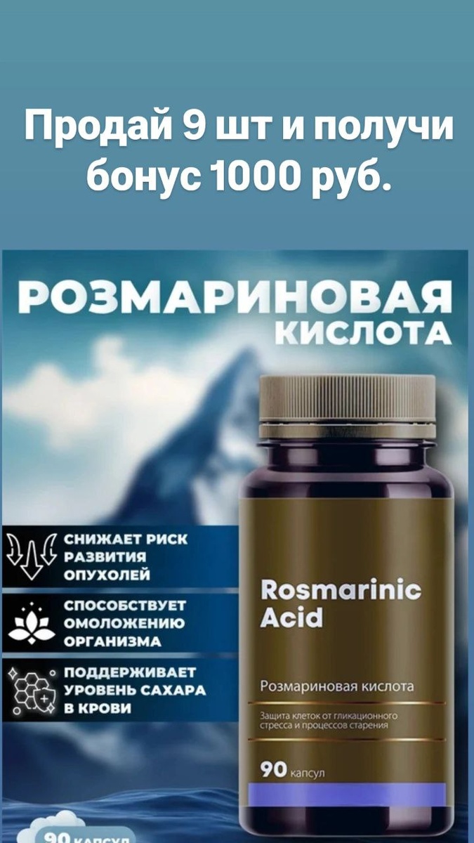 »! 🔥 Команда, привет! Мы запускаем мощную промоакцию на один из самых крутых и недооцененных продуктов — Розмариновую кислоту. 🌿 Это ваш шанс не только помочь клиентам сохранить молодость и здоровье, но и получить дополнительный денежный бонус на свой счет! 💰 УСЛОВИЯ ПРОСТЫ: Продай всего 9 штук Розмариновой кислоты до конца недели и получи 1000 рублей бонусом от меня на свой внутренний счет! Почему Розмариновую кислоту продать ЛЕГКО? (Ваша шпаргалка для клиентов): 📍 Остановка старения (Антигликация): Она не дает сахару «склеивать» волокна коллагена. Это спасение от морщин и «сахарного лица». 📍 Защита от опухолей: Мощный онкопротектор, который защищает клетки на уровне ДНК. 📍 Контроль сахара: Помогает держать уровень глюкозы в норме (идеально в паре с Хромлипазой или ГлюкаБоксом). 📍 Ясный мозг: Улучшает когнитивные функции и защищает нервные клетки. Кому предлагать? — Тем, кто следит за молодостью кожи. — Сладкоежкам (для защиты от последствий сахара). — Тем, кто заботится