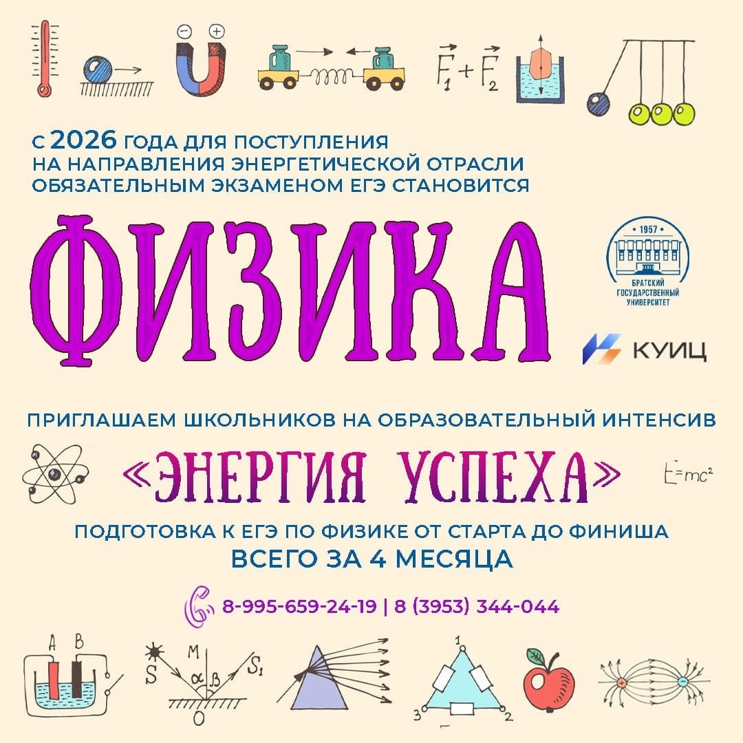 ! ⚡️ С 2026 года для поступления на направления энергетической отрасли обязательным экзаменом ЕГЭ становится физика! 🎓 БрГУ совместно с КУИЦ ЭН+ ИРНИТУ приглашают школьников на образовательный интенсив «Энергия успеха» - подготовка к ЕГЭ по физике от старта до финиша всего за 4 месяца. Приём заявок продлен до 05.02.2026. Обучение - бесплатное!📌 📞 Телефоны для записи и справок: 89956592419 8 (3953) 344-044 👉 Сделай шаг к профессии в энергетике уже сегодня! #абитуриенту
