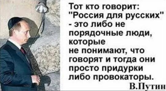 Тов. Путин: "Тот, кто говорит: «Россия — для русских»... ... просто придурки, либо провокаторы, потому что Россия — многонациональная страна". 2003 год.
