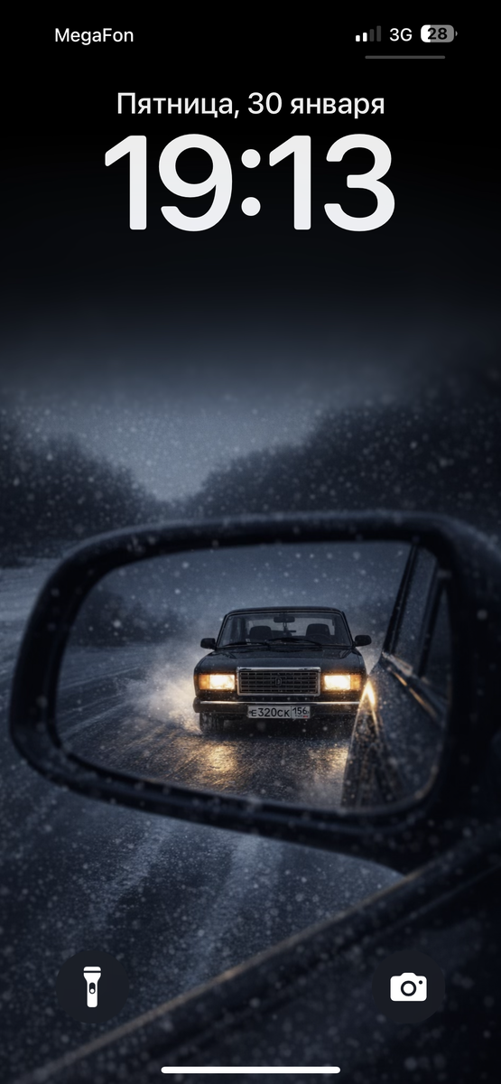 Фон вне зеркала: тёмная размытая зимняя дорога ночью, минимум деталей.