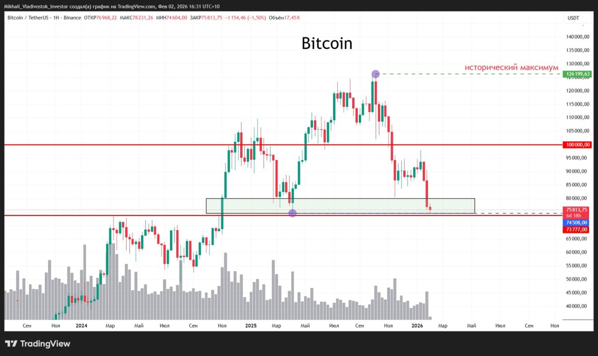 #Биткоин #BTC #Bitcoin $BTG6 Таймфрейм дневной А вот про крипту мы теперь в основном будем говорить в новом канале. И новости и аналитику и торговые идеи ✍️ Присоединяйтесь 😉 https://t.me/DV_Investor Ну что... криптаны в панике походу. Меня тоже иногда одолевает какая-то апатия. 😃 И в этот момент я вспоминаю 2021, когда эфир падает на 80$ и майнинг даже не окупает электричество. И после того как все заныли, рынок начинает бурный рост. Так же думаю будет и в этот раз. 😇 -Биткоин идет за глобальной ликвидностью с лагом по времени -ФРС продолжает вливать ликвидность в систему -Wall Street внедряет блокчеин -Токенизация активов -И многое другое А биток не растет. Тут конечно геополитика вносит свои коррективы. Ну да ладно. Переходим к технике. И смотреть будем недельный таймфрейм для наглядности. Бит пришел к своему предыдущему минимуму 74500 + зеркальный уровень 73777. Ждем отсюда реакцию покупателя. Пока спроса к сожалению не видно. Ну это начало недели к тому же. Ну а если пробива