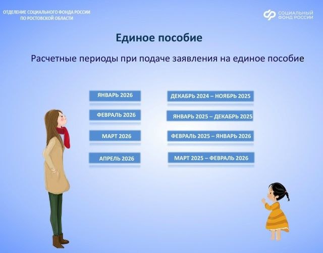 Единое пособие назначается на год. После истечения этого периода для продления выплаты гражданам необходимо подать новое заявление. В Соцфонде рассказали, когда подавать заявление на продление единого пособия. Подать заявление на продление выплаты можно в последний месяц периода прежнего назначения меры соцподдержки. Например, пособие одобрено по январь. В таком случае подавать заявление можно как в январе, так и в феврале. При назначении выплаты проводится комплексная оценка нуждаемости семьи: учитываются доходы и имущество. Все трудоспособные члены семьи должны иметь доход, либо уважительную причину его отсутствия. Расчетный период для единого пособия – 12 месяцев, предшествующих 1 месяцу перед месяцем подачи заявления. Подать заявление на получение единого пособия можно одним из удобных Вам способов: на сайте госуслуг, в клиентских службах Отделения СФР по Ростовской области или МФЦ.