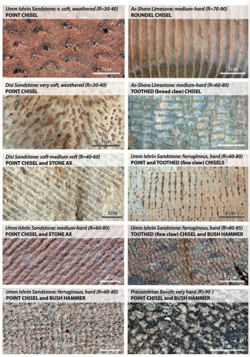 Различные литологические типы камня, характерные для архитектурного ансамбля Петры, в сравнении с типами зубил и следами обработки