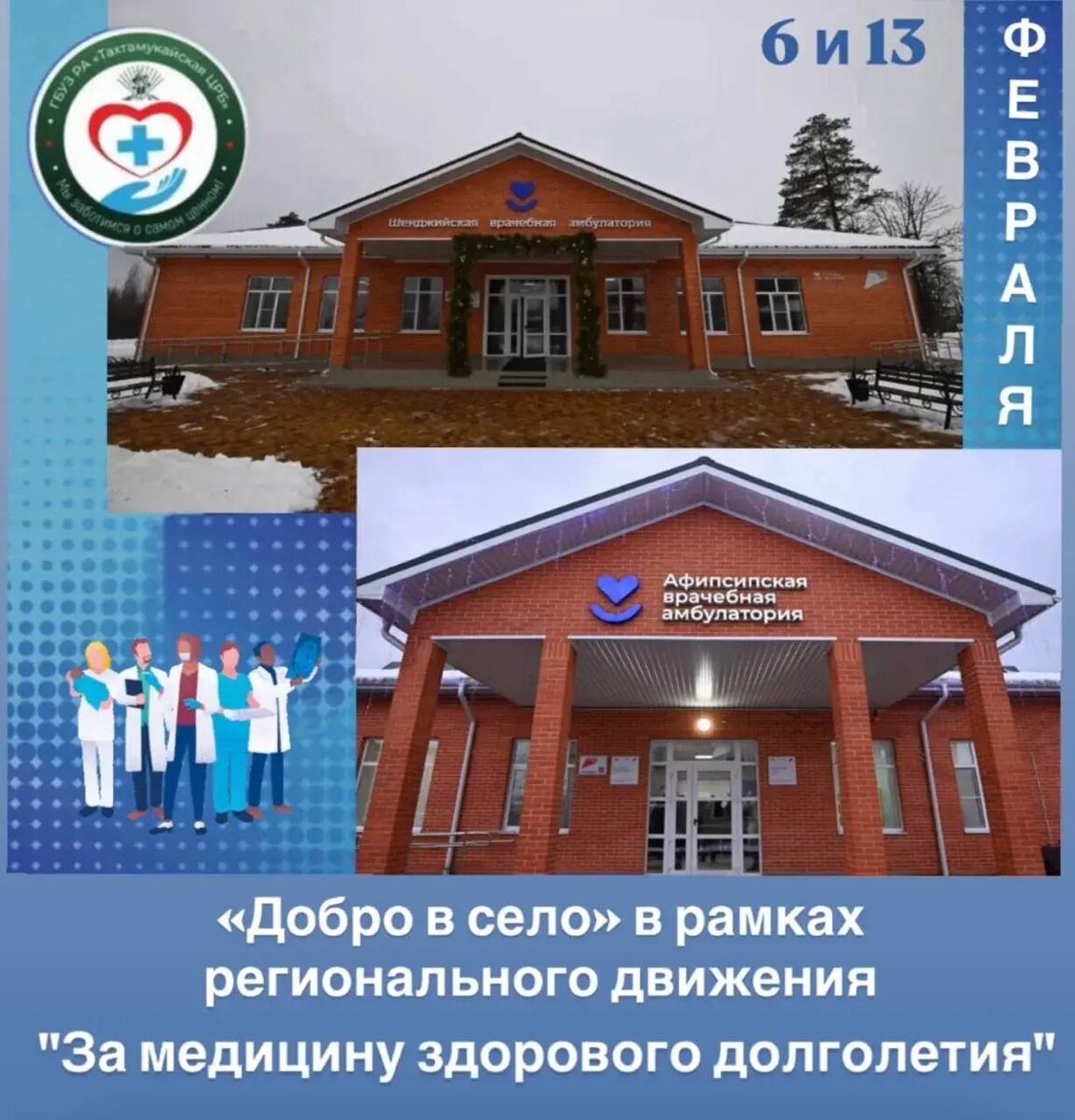 В Тахтамукайском районе стартуют выездные мероприятия регионального движения «За медицину здорового долголетия». Его цель — помочь людям сохранить здоровье и увеличить продолжительность жизни. Особое внимание уделят выездной работе в отдалённых населённых пунктах — чтобы медицинская помощь стала доступнее для всех жителей района. Развитие эффективной системы профилактических обследований — одно из главных направлений национального проекта «Продолжительная и активная жизнь». Дата: 6 и 13 февраля . Время: 9:00. Место: Афипсипская врачебная амбулатория 6 февраля и Шенджийская врачебная амбулатория 13 февраля . Что будет доступно жителям - консультации специалистов : 🩺 Кардиолог 🧠 Невролог ⚕️ Гинеколог 👀 Офтальмолог ✨ Эндокринолог 💊 Терапевт 🦵 Ортопед-травматолог 🤱 Педиатр ✅Флюорография органов грудной клетки ✅Маммография ✅Электрокардиография Приглашаем всех провести этот день с пользой для здоровья!