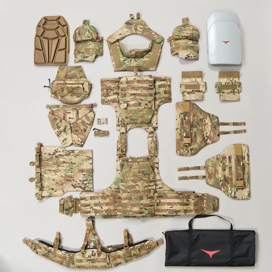 MOLLE-крепления размещены на груди, спине, камербандах, поясе, что позволяет собрать индивидуальную конфигурацию под задачу. Карманы для бронеплит рассчитаны на размеры до 32x25x3 см (M) или 36x26x3 см (L). Вес без дополнительных модулей составляет примерно 8 кг, с полным комплектом защиты — около 12 кг.