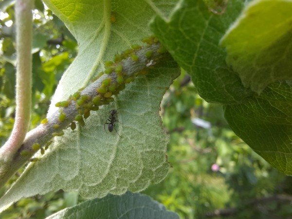 В начале лета тля атакует. Разные виды тли селятся на смородине, крыжовнике, яблоне, сливе. Если поражение не очень сильное, можно попробовать защитить растения без специальных препаратов. Тля высасывает растительные соки из листьев, тем самым ослабляя растение и нанося ему вред. Но сама по себе тля - существо довольно беззащитное. Их сила в количестве. Если уничтожить значительный процент особей, можно существенно снизить численность тлей и урон. Тля скапливается на концах побегов, там, где листья молодые и нежные. Эти места срезаем секатором и сжигаем. Все равно рост побега уже ослаблен. Учитываем, что обрезка спровоцирует рост боковых побегов, в дальнейшем за ними нужно будет последить. Обрезка зависит от культуры. Второе, что можно сделать - смыть тлю сильным напором воды из шланга. Тля падает на землю, большая ее часть гибнет или не может вновь забраться на растение. Эту процедуру нужно повторить два-три раза с некоторым перерывом. Колонии тлей станут значительно меньше. А там и д