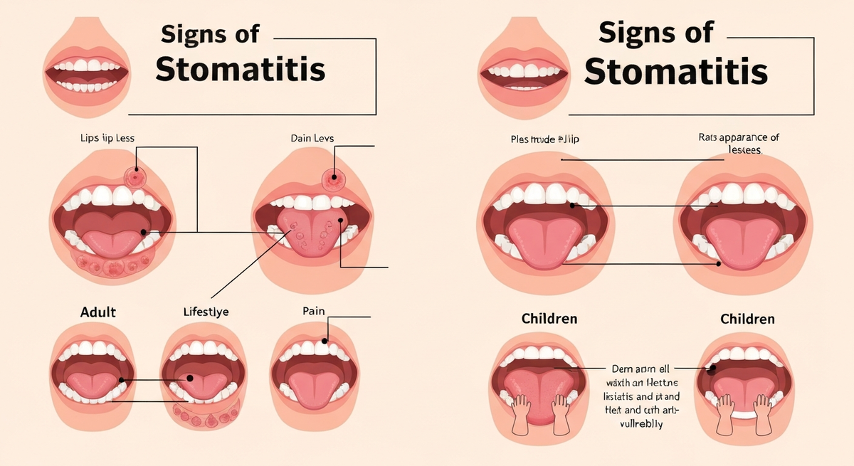 У взрослых стоматит может проявляться в различных участках ротовой полости, что часто является ключом к определению его типа.