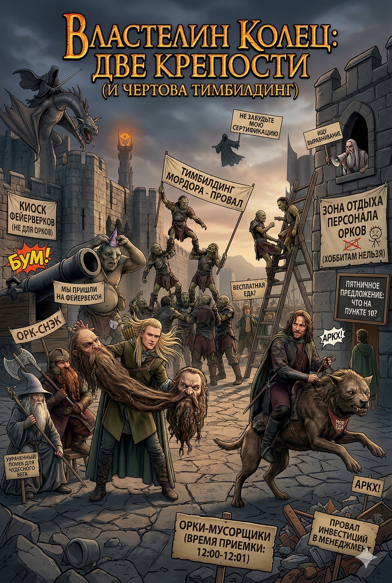 Наша троица бежит по полям Рохана, как участники «Форт Боярда» без ведущего. Это лучший броманс в истории кино. Леголас бежит по снегу, не проваливаясь (потому что эльфы невесомые зануды), Арагорн бежит как нормальный мужик, а Гимли, чьи короткие ножки и доспех весят как танк, просто катится кубарем с горок, ругаясь на эльфов на своем гномьем. Их диалоги — золото: Леголас (видит вдали энтов): «Там идут какие-то деревья!». Гимли (не глядя): «Это твои родственники?».