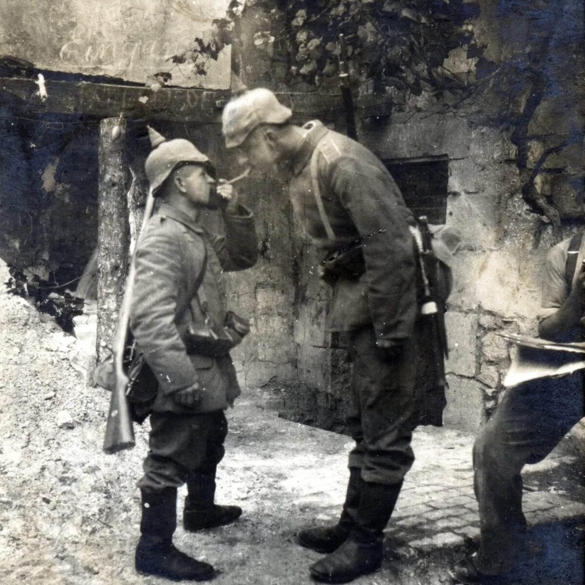 Самый низкий и самый высокий немецкие солдаты из батальона прикуривают сигареты, около 1915 года.