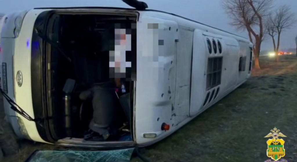 Автобус с вахтовиками перевернулся из-за гололеда и ветра в Анапском районе