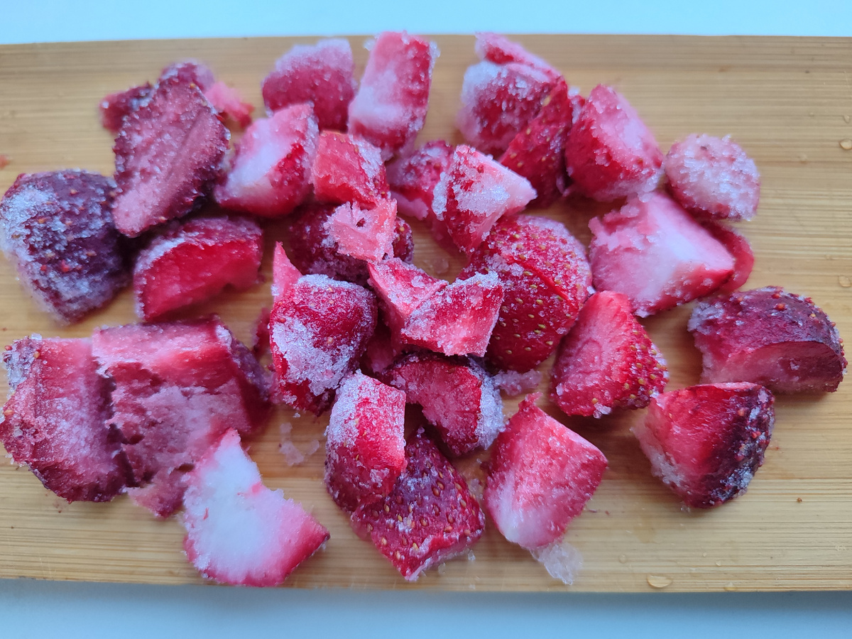 Начнем с того компонента, который и придаст напитку цвета, вкуса и летней нотки. Правда, можно и потом нарезать, но это для лета – когда жарко. А мне надо, чтобы клубничка хоть немного растаяла своим путем.