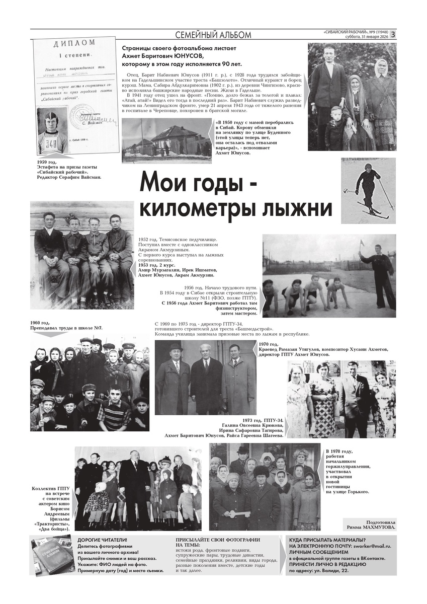 Укажите: ФИО людей на фото, примерную дату и место съемки, историю этого момента. Темы для историй: истоки рода, фронтовые подвиги, супружеские пары, трудовые династии, семейные праздники, виды города, разные поколения вместе, детские годы, интернациональные семьи, семейные реликвии. Как отправить материалы: Email: sworker@mail.ru с пометкой «Семейный альбом», сообщением в группе газеты ВКонтакте. приносите в редакцию: ул. Валиди, 22.