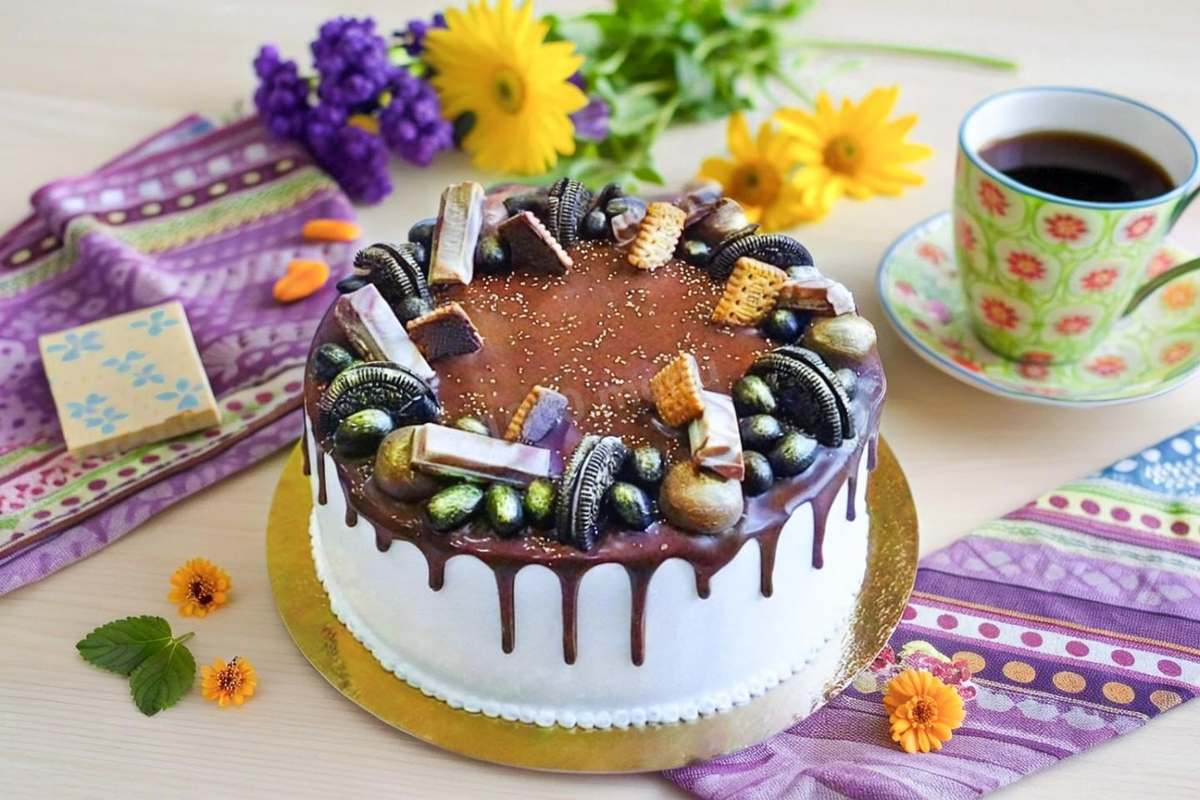 Верх торта украшаем шоколадными конфетами и печеньем (или другими любимыми лакомствами).