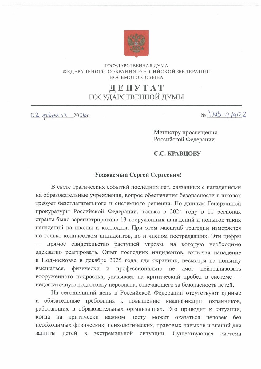 После трагических событий последних лет, включая 13 вооруженных нападений на учебные заведения только в 2024 году, стало очевидно: текущая система охраны образовательных организаций не справляется. Охранники зачастую не имеют ни специальной подготовки, ни психологической устойчивости, ни правовых знаний для реагирования на экстремальные угрозы. ⁉️Вместе с руководителем фракции «Справедливая Россия» Сергеем Мироновым направили Министру просвещения РФ Сергею Кравцову предложение о немедленной разработке обязательной программы повышения квалификации для школьных охранников. Предлагаем ввести единые требования: 🔴возраст 25–50 лет, 🔵среднее профессиональное образование, 🔴трехмесячный курс по детской психологии, деэскалации, действиям при ЧС, первой помощи и правовым основам применения силы, 🔵ежегодное психологическое тестирование и аттестацию раз в три года. Кроме того, считаем, что необходимо разрешить таким подготовленным охранникам носить травматическое оружие на территории школы.