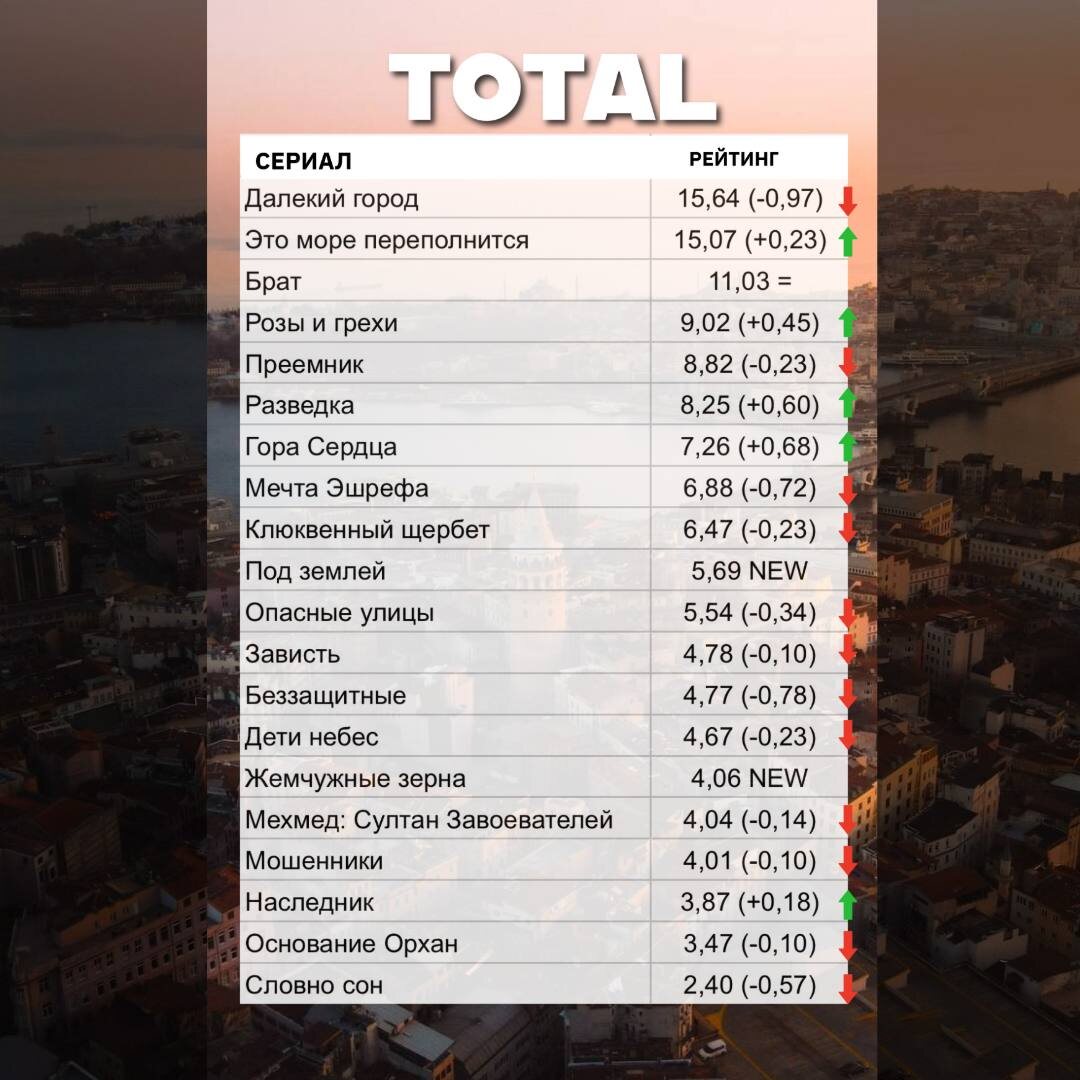 Пока одни проекты уверенно держатся в топе, другие сталкиваются с неожиданными препятствиями — от футбольных матчей до рискованных сюжетных поворотов. Минувшая неделя показала: даже сильные сериалы больше не застрахованы от падений. Разбираем, что происходит в рейтингах турецких сериалов и кто сейчас действительно контролирует внимание зрителей. «Далёкий город» сохраняет 1 место в категории Total, подтверждая массовую популярность. В более узких аудиториях AB и ABC1 сериал остаётся на 2 позиции, демонстрируя устойчивый, но не максимальный охват. «Это море переполнится», напротив, доминирует именно среди платёжеспособной аудитории: 1 место в AB и ABC1, а также уверенное 2 место в Total. Проект продолжает быть одним из самых ценных для рекламодателей. «Брат / Семья — это испытание» остаётся самым ровным сериалом недели — 3 место во всех категориях, темп роста стабилизировался. Важно отметить: колебания рейтингов у лидеров минимальны и находятся в пределах нормы аудитория у этих проектов