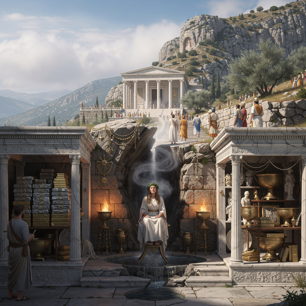 Высоко на склонах Парнаса, где скалы встречаются с облаками, лежало место, которое древние считали пупом Земли. Здесь, среди оливковых рощ и лавровых деревьев, из расщелины в скале поднимался легкий, едкий дым. Его вдыхала Пифия, жрица Аполлона, прежде чем впасть в транс и изречь волю бога. Но за этим священным мистическим действом скрывалась иная, гораздо более земная реальность. В то время как Пифия вещала из внутреннего святилища – адитона, в окружавших храм мраморных сокровищницах копились тонны серебра, золота и слоновой кости. Дельфийский оракул, сердце античной духовности, одновременно стал одним из самых могущественных экономических центров древнего мира – не банком в современном смысле, но уникальным институтом, где сакральный авторитет конвертировался в колоссальные богатства и влияние.