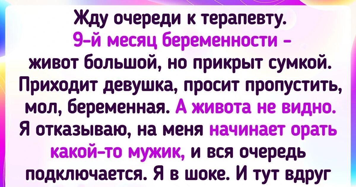 “Сижу в очереди к терапевту, девятый месяц беременности, живот прикрыт сумкой. Приходит девушка и просит пропустить, говорит, что беременная. Я отказываю. Тут подключается мужик, потом вся очередь, на меня орут. В этот момент открывается дверь, и я встаю. Сначала встает живот, потом я. В тишине захожу в кабинет. Никто больше не сказал ни слова.”