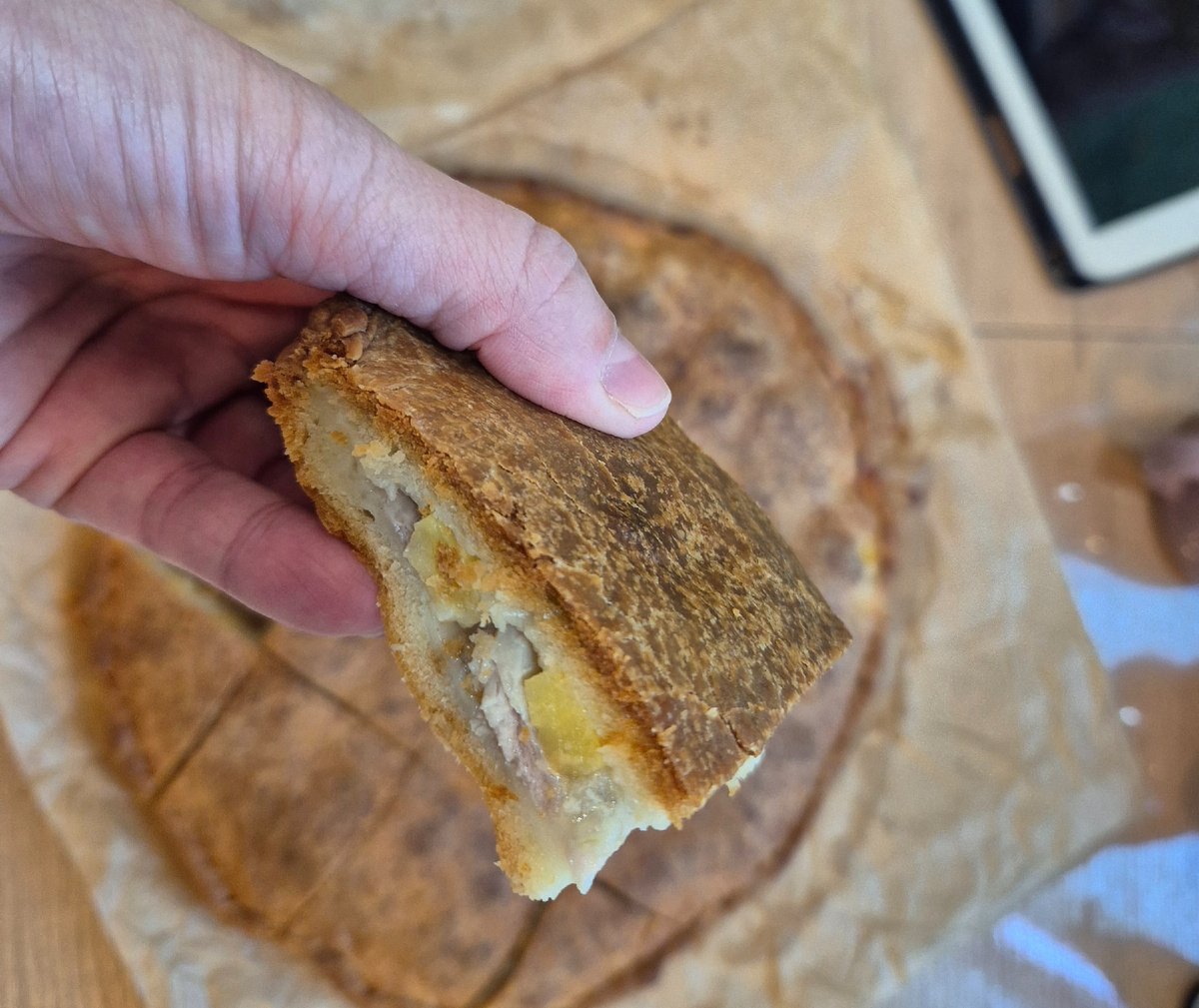 Когда тесто подошло, делим его на две части, одну часть раскатываем и укладываем на противень, сверху начинка и закрываем сверху второй частью теста. Можно оставить лёгкие проколы вилкой.
