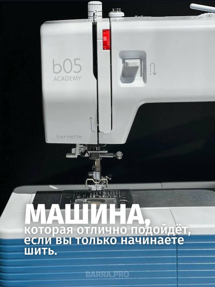 Это малышка Bernette b05 Academy. Одна из лучших машин, которая сейчас попадает в категорию до сорока тысяч рублей. Она сочетает в себе надежность, простоту, широкий функционал и богатую комплектацию. Большой выбор лапок - целых 12 штук, приставной столик в комплекте. Машина оснащена ограничитем, который предохраняет руки от попадания под иглу, что особенно полезно для начинающих. Регулировка прижима лапки, позиционирование иглы, горизонтальный челнок, 30 швейных операций, одна из которых - автоматическая петля. Самое приятное, что сейчас действует специальное предложение: 💙ШВЕЙНАЯ МАШИНА BERNETTE B05 ACADEMY - 39 900₽ 49 900₽, А так же скидка на вторую машину этого модельного ряда ❤️ШВЕЙНАЯ МАШИНА BERNETTE B05 CRAFTER - 34 900₽ 44 900₽. 🎁 Бесплатная доставка оборудования до дверей вашего дома; 🔄 Трейд-ин: с выгодой обменяем вашу старую технику на новую (условия здесь); 👛 Рассрочка и кредит; Наш сайт BARRA.PRO BARRA, г. Воронеж, ул.Средне-Московская 5 Если вы горите желанием на