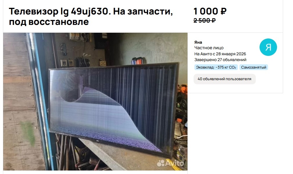 — Да он мёртвый, кому он нужен? А я уже насмотрелся блогов на YouTube и понимал: 📺 даже разбитые телевизоры покупают — на запчасти. Забрал, выставил на Авито за 2500 рублей, честно указал, что экран разбит.