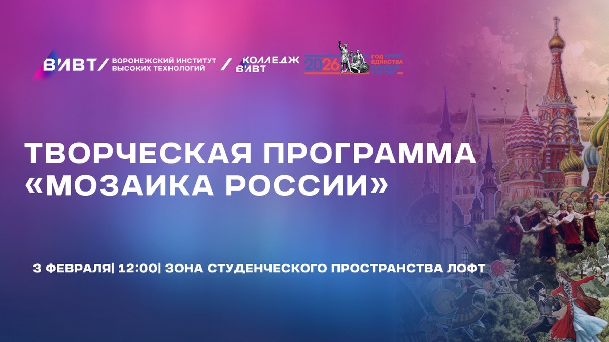 ! 3 февраля в 12:00 приглашаем вас на интерактивную программу «Мозаика России». Мероприятие пройдёт в зоне студенческого пространства «Лофт». Наша программа — это яркий праздник единства и многообразия культур. Вас ждут задорные хороводы дружбы, увлекательные национальные игры, душевные песни и зажигательные танцы. Особая часть встречи — кулинарный фестиваль, где вы сможете познакомиться с блюдами разных народов и принять участие в дегустации. Название «Мозаика России» выбрано не случайно. В соответствии с Указом Президента РФ 2026 год объявлен Годом единства народов России. Это важное решение подчёркивает ценность межнационального согласия и сохранения культурного наследия. Россия — уникальная страна, где в мире и согласии живут более 190 народов. Каждый из них вносит свой неповторимый вклад в общую культурную палитру: бережёт родной язык, традиции, кулинарные особенности и самобытные обычаи. Наша семья ВИВТ — живое отражение этого многообразия: среди студентов представлены свыше