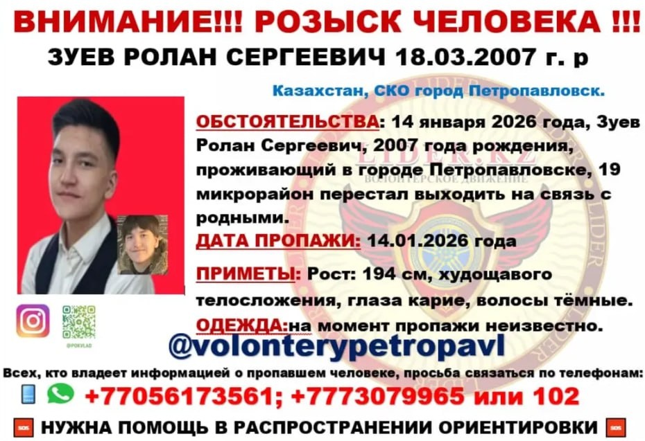 Ролана Зуева потеряли родственники, с которыми он перестал выходить на связь в середине января, рассказывает Петропавловск.news. 18-летний парень, проживающий в 19 микрорайоне, перестал выходить на связь 14 января 2026 года. Приметы: рост 194 см, худощавое телосложение, глаза карие, волосы тёмные. Всех, кто располагает какими-либо сведениями о пропавшем, просят обратиться по телефонам волонтёров: 8-705-617-35-61, 8-777-307-99-65 или 102. #новостиСКО #СКОновости #новостиКазахстана #новости #новостиПетропавловска