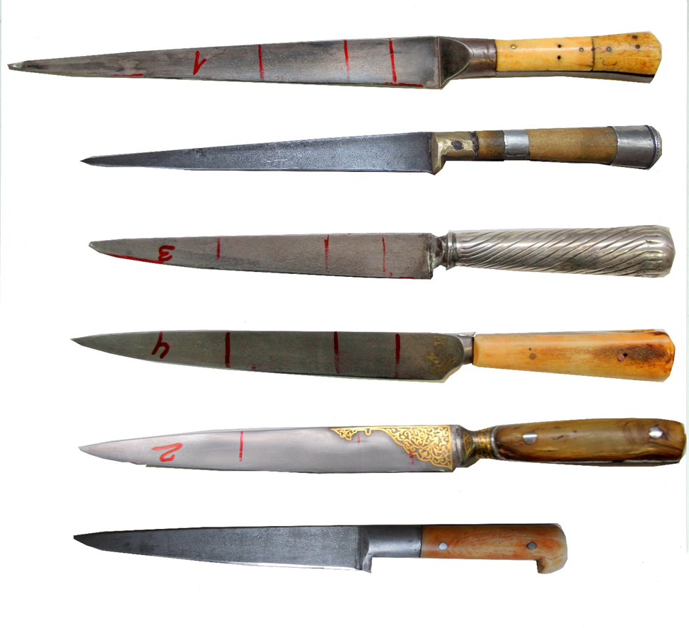 Были организованы испытания, в которых участвовали 7 булатных ножей типа «кард» из частных коллекций, произведенных в индо-иранском регионе, и 1 контрольный нож из нелегированной углеродистой стали У12А с содержанием углерода 1.2%С, клинок которого был откован и закален по ГОСТу\стандарту СССР без применения особых приемов ТМО. Определение хим.состава старинных образцов не производилось, поскольку они были предоставлены частными коллекционерами лишь для проведения теста по резу с условием обеспечения сохранности предметов.